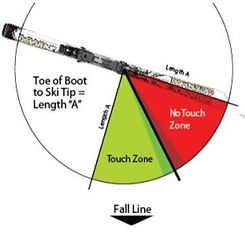 Using the advice provided in the diagram, I start teaching pole touches by using my ski pole to scratch a half circle from the tips to tails of my skis. Then I go out from my ski boot and scratch a line from the arch to my boot. Finally, like cutting a pie, I create one more scratch to cut the front quarter piece in half. The red area shown above is the no touch zone, and the green area the touch zone.